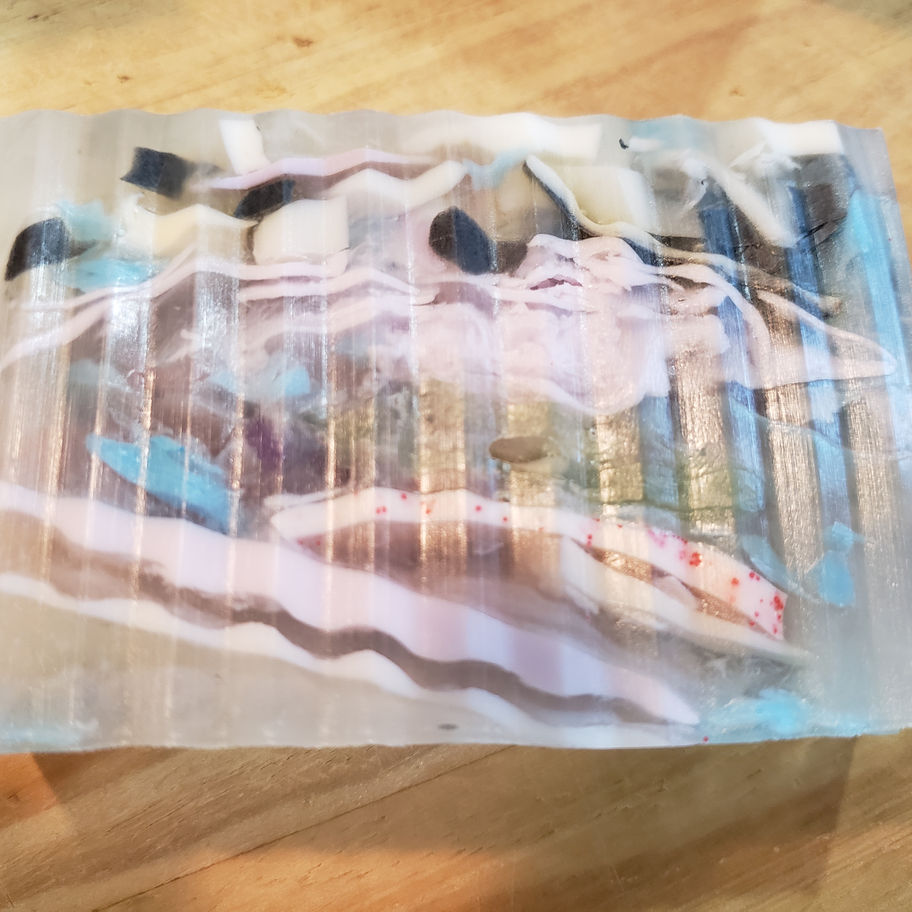 Glycerin soap base made with embedded soap pieces. Contains real honey which is thought to be very high in natural antioxidants and anti-microbial benefits. It is scented with orange, lavender and pine with notes of patchouli, lemongrass, cashmere and musk. Umm, umm, it smells so good!